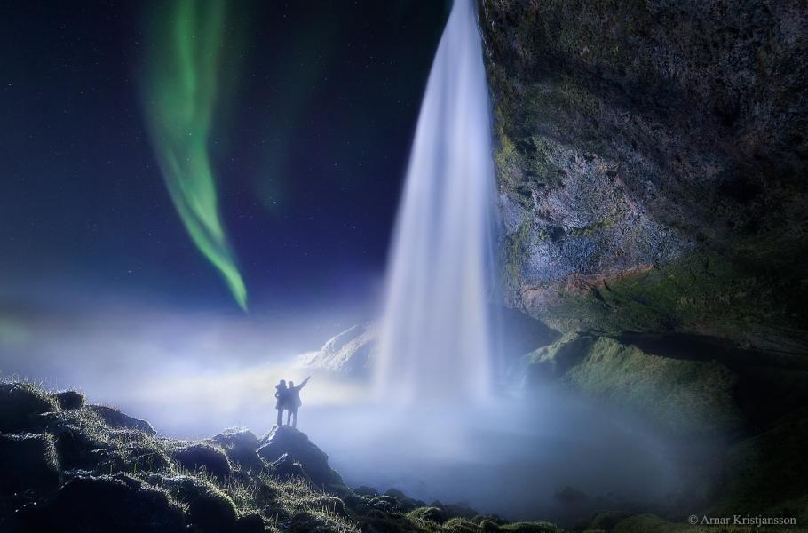 Jen málokterá podívaná vzbuzuje více romantiky než polární záře. Islanďan Arnar Kristjansson by ale nejspíš nesouhlasil. Spolu se svou partnerkou vyrazil na lov polární záře k nádhernému vodopádu Seljarlandsfoss na jihu Islandu. K dokonalosti jejich snímku chybí snad již jen koupající se jednorožec a duha.