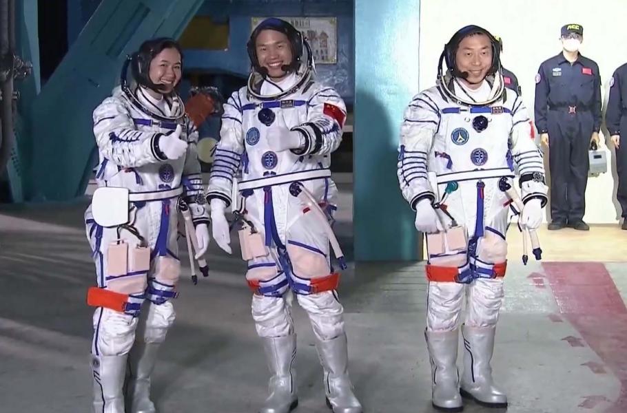 Posádka aktuální mise Šen-čou 19 (zleva): Wang Chao-ceová, Sung Ling-tung a velitel Cchaj Sü-če. (foto: Wikimedia Commons, China News Service, CC BY 3.0)