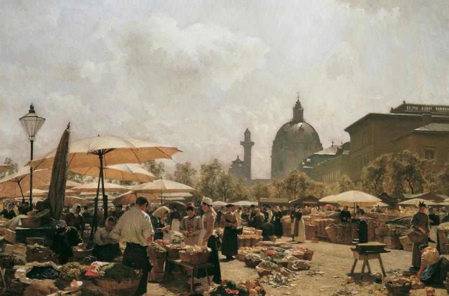 Jen kousek od Café Museum je slavný Naschmarkt – právě tady se každou sobotu dopoledne koná velký bleší trh. (ilustrace: Wikimedia Commons, Carl Moll, CC0)