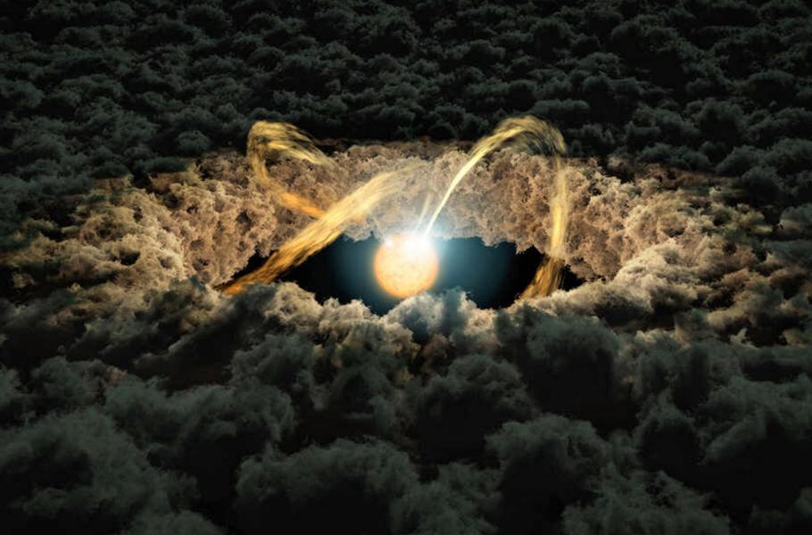Vizualizace protoplanetárního disku kolem nově se tvořící hvězdy. Část světla z erupcí dopadá na okraj disku a vytváří ozvěnu, která astronomům umožňuje vypočítat jeho velikost. (foto: Shutterstock)