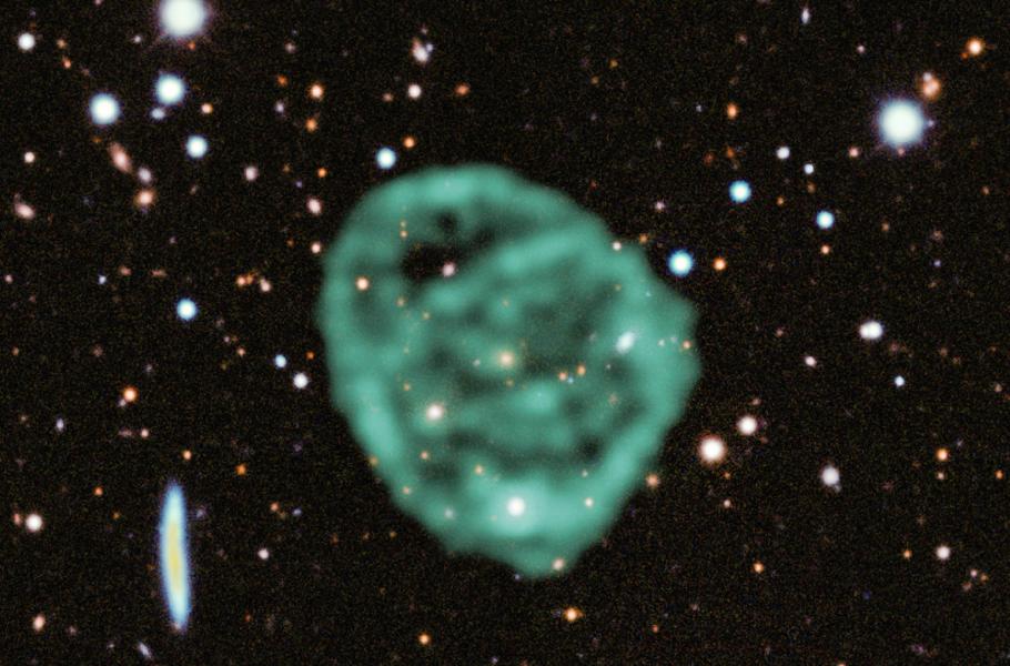 Dosud nejlepší snímek podivného rádiového kroužku pořídila nedávno jihoafrická soustava radioteleskopů MeerKAT. (foto: University of Manitoba, Jayanne English, CC BY 4.0)