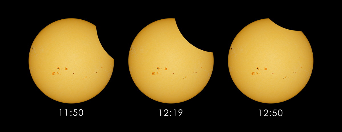 Na naši hvězdu se zaměřte nejpozději v 11:37 SEČ, kdy se při jejím pravém okraji objeví temná silueta Měsíce. Bude ovšem postupovat směrem k hornímu okraji slunečního disku, takže se o něj víceméně jen otře. Maximální fáze nastane nedlouho po začátku úkazu, již ve 12:19, kdy Měsíc zakryje zhruba pětinu průměru slunečního kotouče – což naštěstí stačí, aby bylo zatmění bez problémů viditelné i pouhýma očima. Následovat bude ústup Měsíce ze Slunce a ve 13:01 částečné zatmění skončí při horním okraji jeho disku.