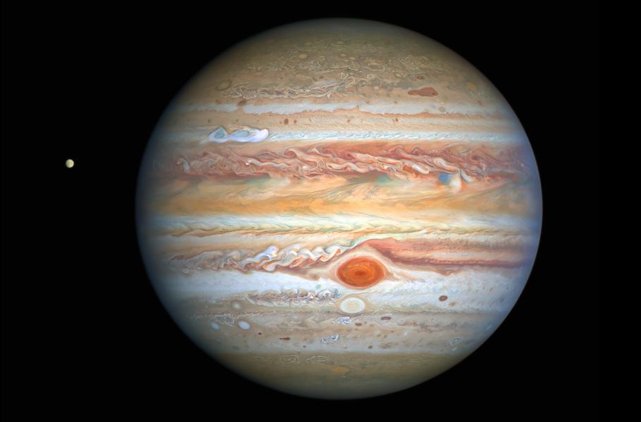 Jupiter a jeho ledový měsíc Europa na snímku pořízeném Hubbleovým vesmírným teleskopem. (foto: NASA, ESA, A. Simon, M. H. Wong, CC BY 4.0)
