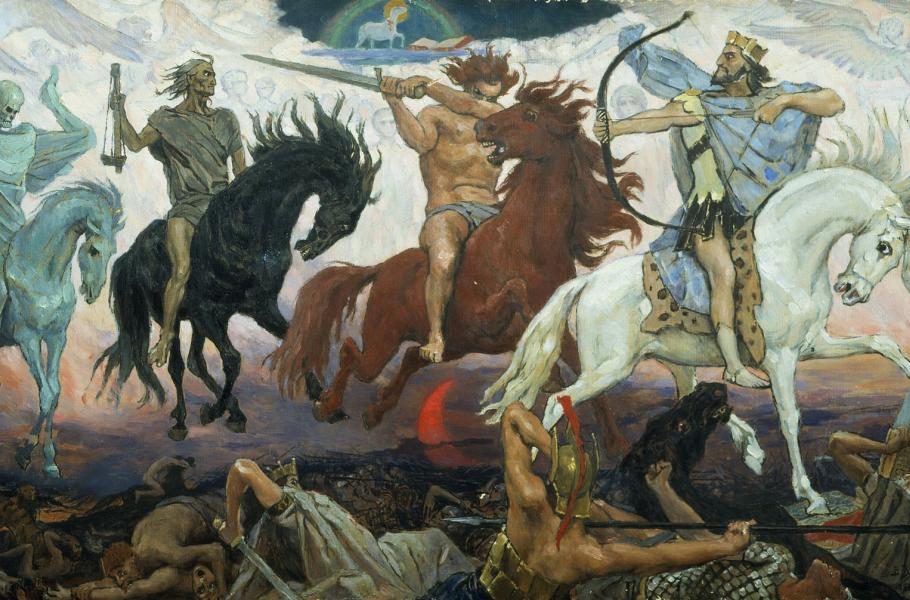 Jezdci apokalypsy v díle Viktora Vasnetsova. Jde o Porobení, Válku, Hlad a Smrt. Nahoře je vidět drobná postava beránka.