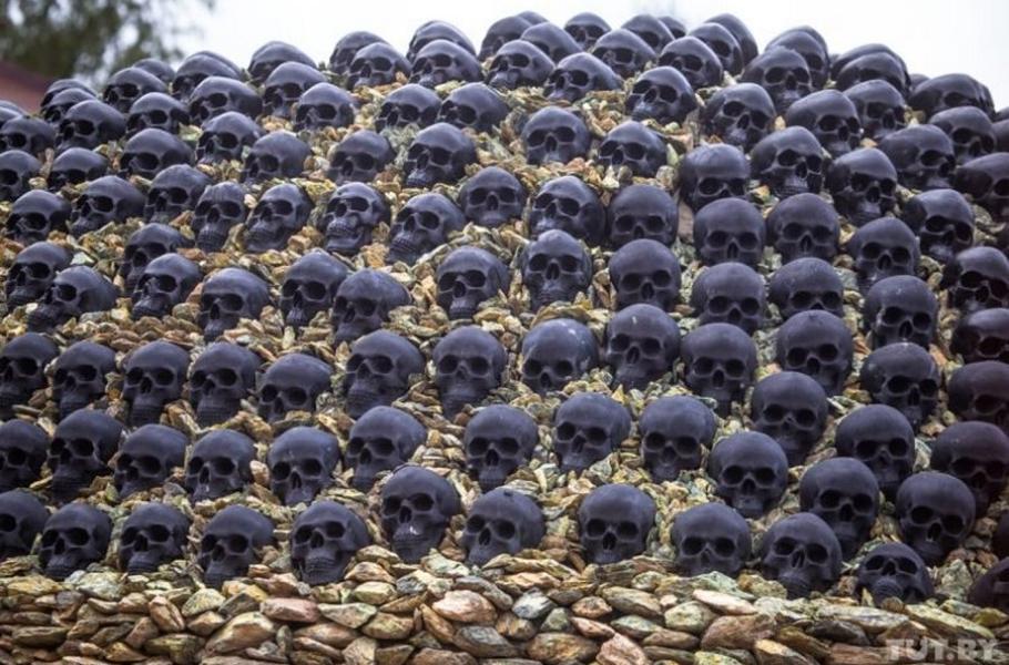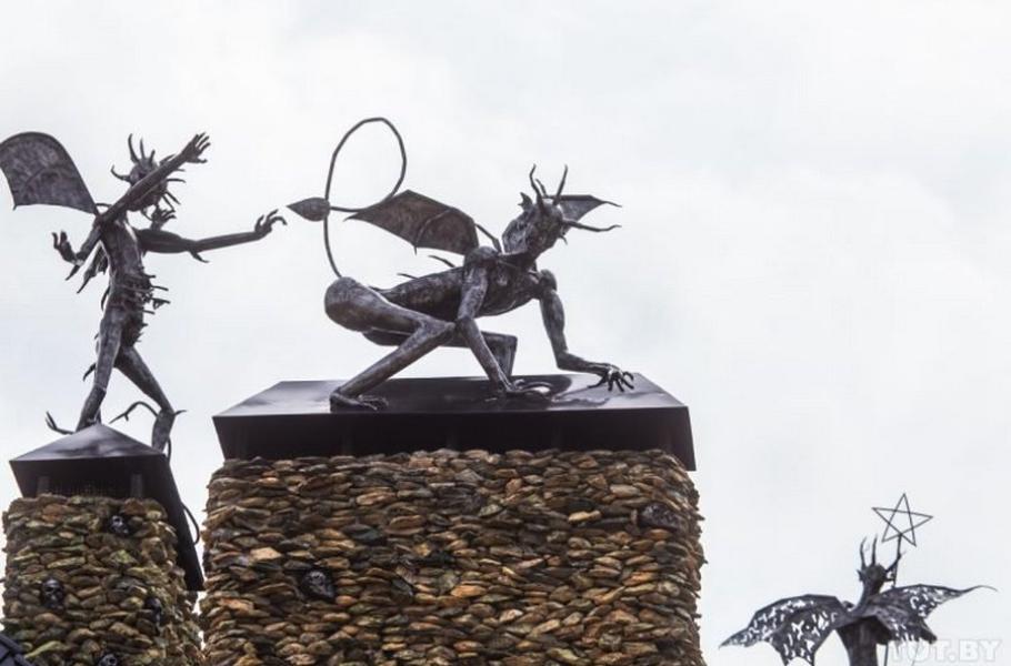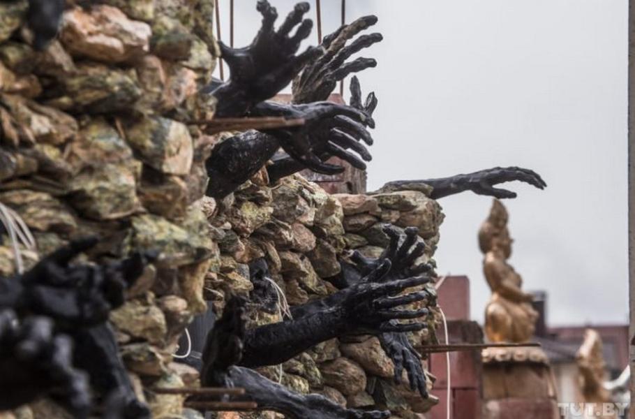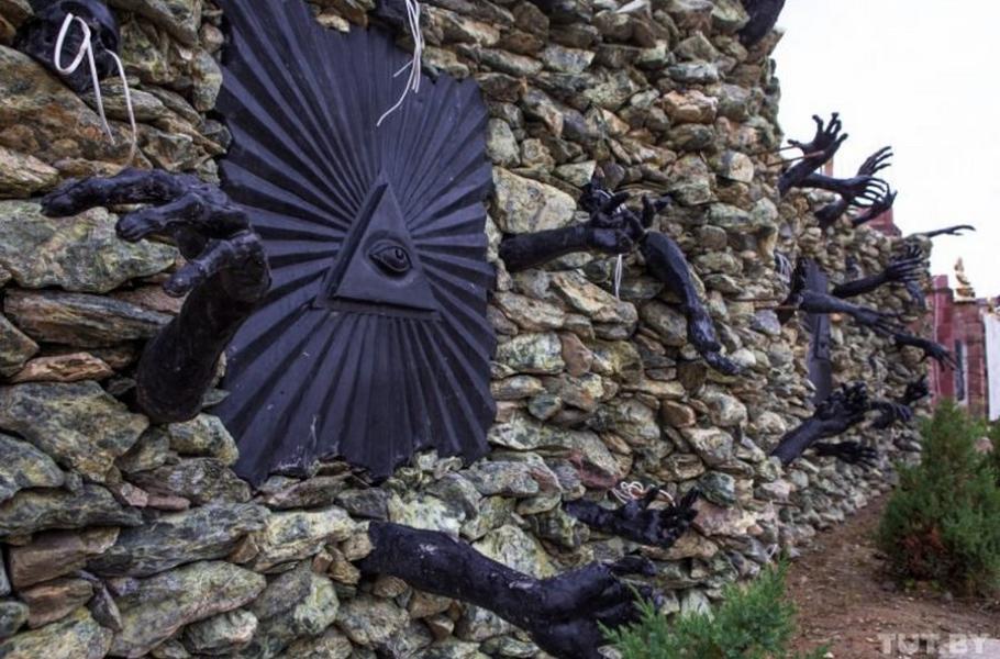 Dům jednoho z místních podnikatelů v běloruské Ratamce zdobí neobvyklá výzdoba. Kamenná zeď oddělující pozemek od ulice je protkána křečovitě vzpínajícími se lidskými údy, někde tvoří část zdi desítky černě nabarvených lidských lebek a po střeše se prohánějí strašidelně vyhlížející démoni.
