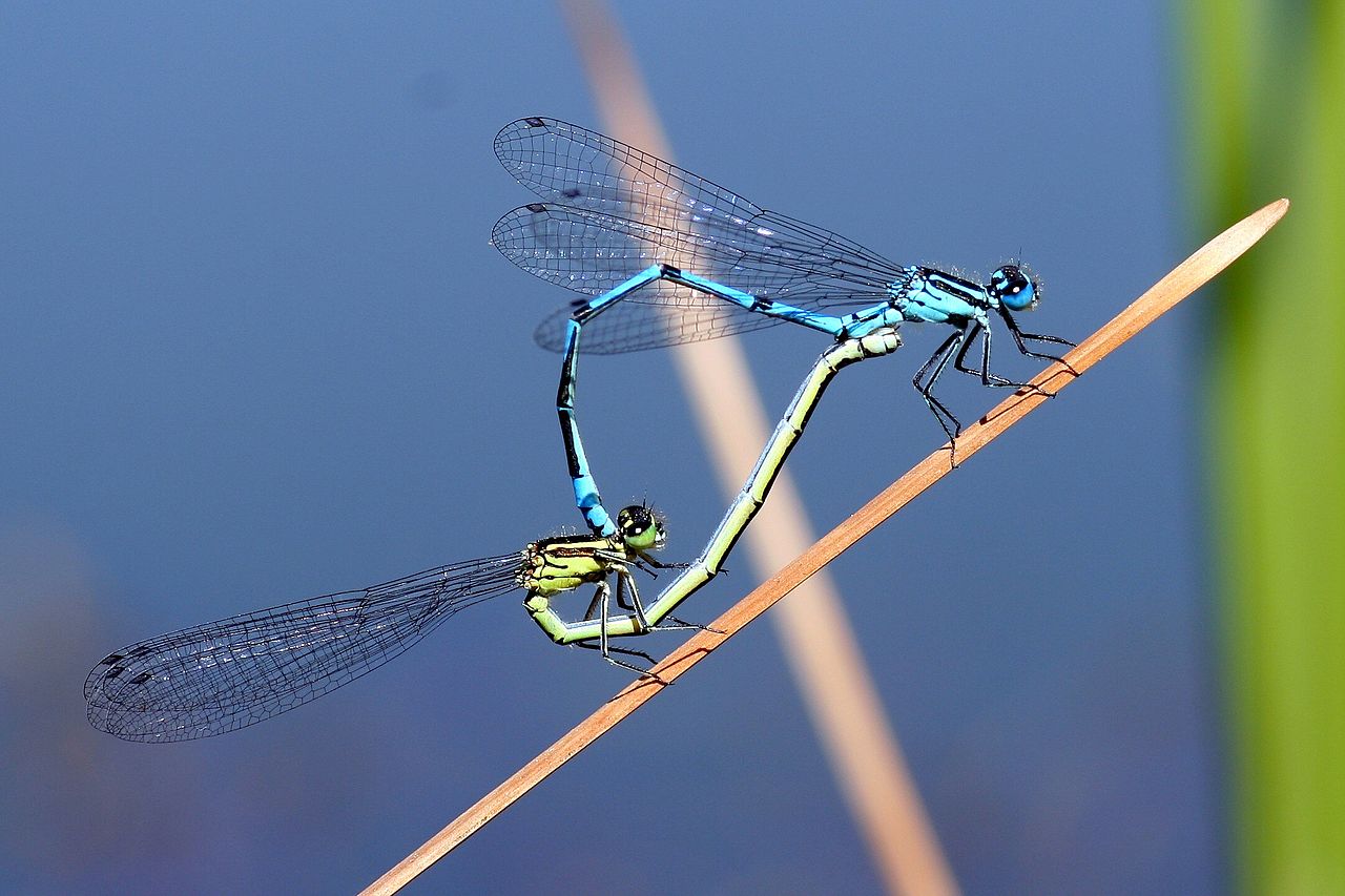 Ve světě žije asi 5 000 druhů vážek, v Evropě 114 druhů a v našich krajinách 69–71 druhů. V životě každého druhu je zásadním obdobím čas páření. V případě vážek je tento akt velmi neobvyklý. Samci mají na druhém a třetím článku zadečku druhotný vnější pohlavní orgán, do něhož přenášejí sperma z pohlavních orgánů na devátém článku zadečku. Před pářením uchopí samec pomocí přívěsků na konci zadečku samici za hruď nebo hlavu. Páření probíhá tak, že samice ohne zadeček pod tělem směrem dopředu a spojí jej s druhotným orgánem samce. V závislosti na konkrétním druhu probíhá páření v klidu na vegetaci nebo za letu. Ale vždy před a po páření můžeme vidět vážky létat spojené v milostné „figuře.