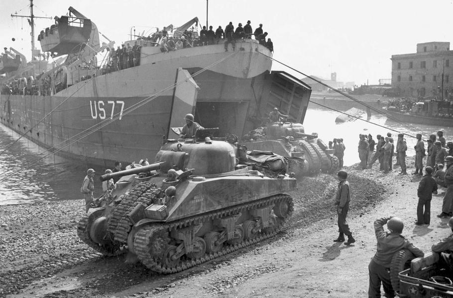 Americký tank Sherman právě opouští vyloďovací plavidlo a míří do nitra Itálie. (foto: Wikimedia Commons, U.S. Army, PDM 1.0)
