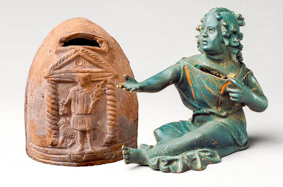Vlevo vyobrazený bůh obchodu a bohatství Merkur v ruce drží pytel s penězi, pokladnička ve tvaru úlu z 2. století. Vpravo římská bronzová pokladnička asi z poloviny 1. století ve tvaru dívky, která má pravou ruku nataženou v prosebném gestu. (zdroj: MDPI/Getty Images (Open Content Program))