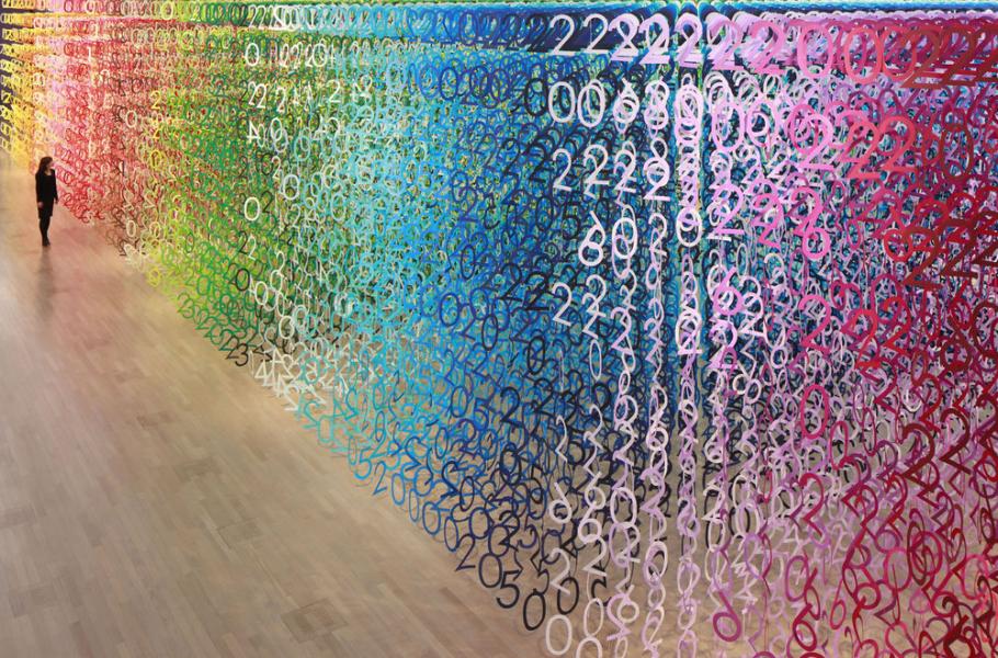 Emmanuelle vytvořila komplikovaný duhový les, čítající 60 tisíc barevných číslic, uspořádaných do trojrozměrných sítí. Číslice jsou rozdělené do deseti vrstev. Ve skupinách vytvářejí letopočty odkazující na deset let historie centra a aby těch desítek nebylo málo – barevná škála čítá 10 × 10 odstínů. Dokonalá oslava dekády!