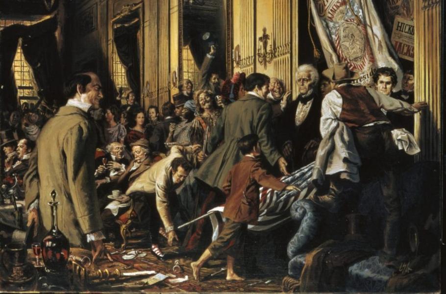 Abychom však byli spravedliví: Zmínky o řádění přívrženců nejspíš zveličili Jacksonovi političtí nepřátelé, protože dobové noviny zmiňují, že si potřásl rukou s početným davem a několik kousků vybavení nechtěně poškodili hosté, kteří se „neopatrně otočili“.