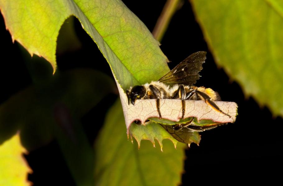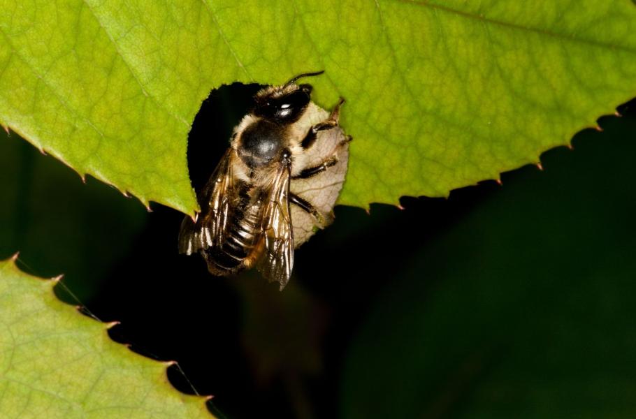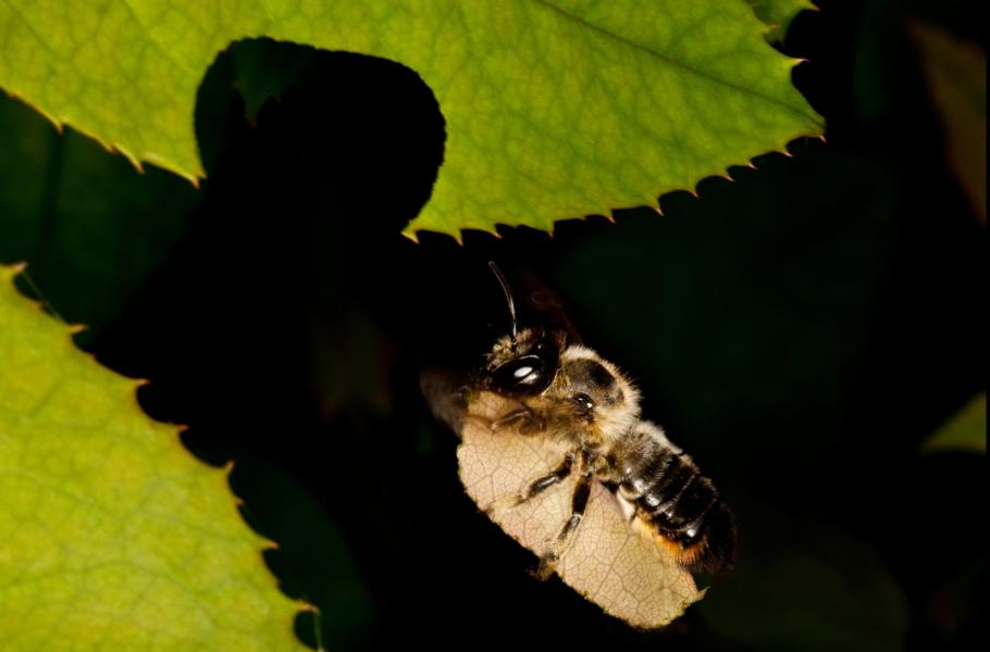 Náhle s bzukotem přilétá větší včela, chvilku krouží okolo rostliny a vybírá si vhodné místo. Pak usedne na okraj listu, do kterého okamžitě zanoří kusadla. Jako ostrými nůžkami z něj ukrajuje půlměsíc…