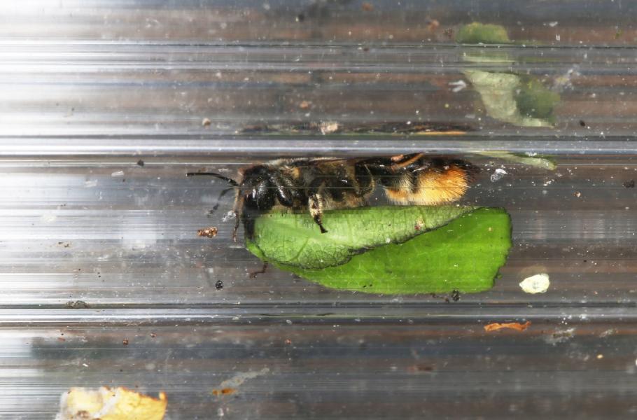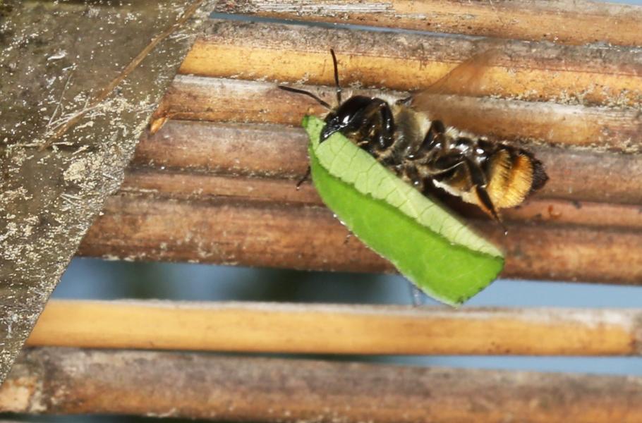 Včela se do svého úkolu pouští šikovně s viditelnou rutinou. Drží plátek listu v kusadlech a nohama pod tělíčkem srolovaný tak, že když ho definitivně oddělí od rostliny může s nákladem odletět…