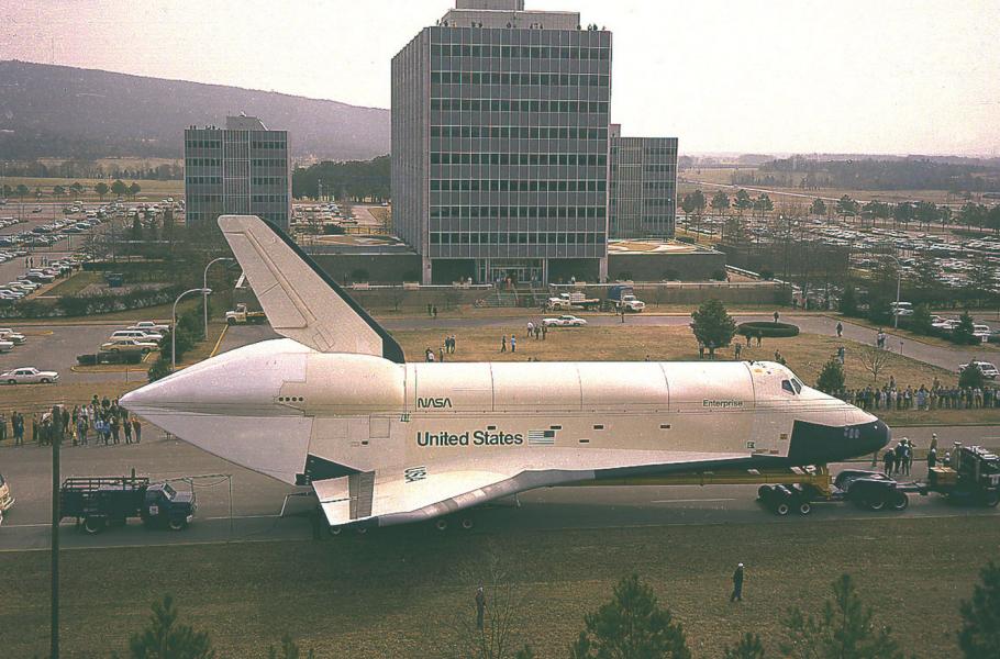 Vyrobilo se v něm a testovalo několik exemplářů prvního stupně obřího Saturnu V, který pak sériově produkovala továrna Michoud Assembly Facility v Louisianě. V MSFC se prováděly dynamické zkoušky zmíněného nosiče i raketoplánů a částečně se tam odehrával také výcvik posádek. Ve středisku se rovněž testovala obří raketa SLS. Na snímku raketoplán Enterprise během testů v roce 1978. (foto: Flickr, NASA/MSFC, CC BY-NC 2.0)