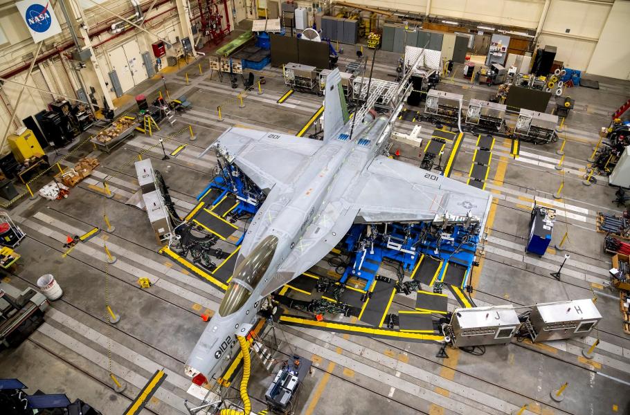Armstrong létal v AFRC na raketoplánech X-15, vypouštěných zpod křídla Boeingu B-52, a později trénoval lunární přistání v zařízení Lunar Landing Research Vehicle (LLRV), přičemž z jednoho se musel kvůli technické závadě katapultovat. Středisko se proslavilo prvními atmosférickými lety raketoplánu Enterprise a jako místo návratu vesmírných letounů z 54 misí – na Floridu je pak přepravoval modifikovaný Boeing 747-SCA. Na snímku stíhací bombardér Boeing F/A-18E/F Super Hornet v jedné z hal AFRC. (foto: Wikimedia Commons, NASA, Joshua Fisher, CC BY 4.0)