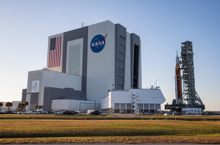 Další důležitý mezník v její historii přinesl 29. listopad 1963: Týden po zavraždění prezidenta Johna F. Kennedyho byla výkonným rozkazem číslo 11129 přejmenována na John F. Kennedy Space Center. Následně vyrostl legendární komplex 39 se dvěma vypouštěcími rampami a gigantickou montážní halou VAB. Rampu 39A si až do roku 2034 pronajímá společnost SpaceX, zatímco z rampy 39B odstartovala loni v listopadu v rámci mise Artemis I obří raketa SLS. (foto: Wikimedia Commons, NASA, Kim Shiflett, CC0)