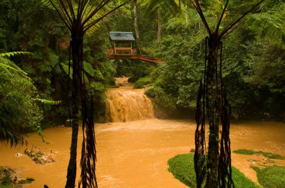 Přestože se džunglí docela loudáme, na vrcholu (1 840 m n. m.) stojíme za hodinku, a tak po chvilce oddechu scházíme další stezkou k Robinsonovu vodopádu. Ten padá po několik metrů vysoké skále a díky blízkosti k městečku je často navštěvovaný. Na opačném konci Tanah Rata, ale také jen v asi kilometrové vzdálenosti, leží Paritův vodopád. Je dost prudký, ale vysoký jen asi metr. Sytě hnědo-oranžová barva vody napovídá, nakolik se intenzivní zemědělství podepisuje na zvýšené erozi.