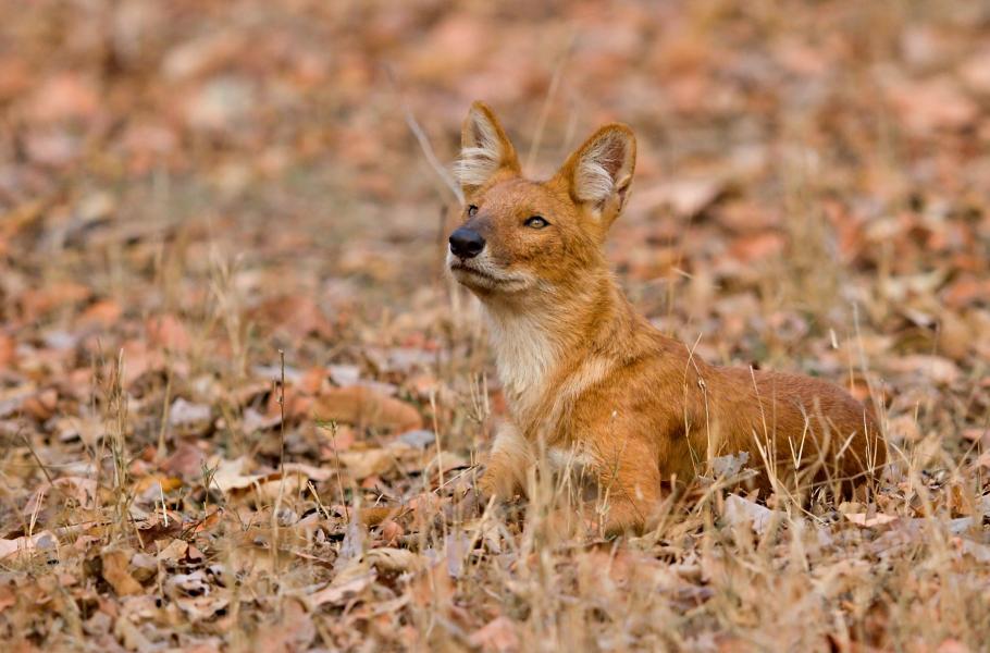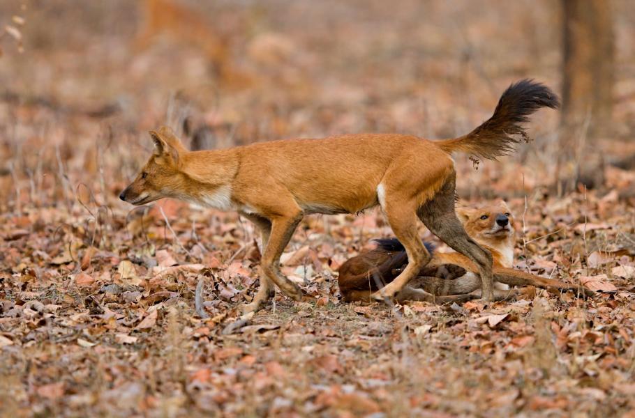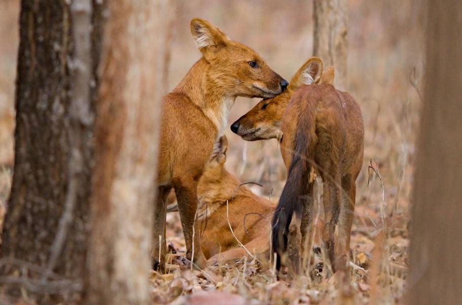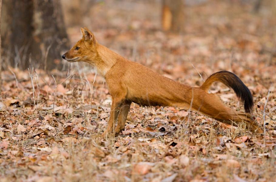 Divoký dhoul fotografovaný v tygří rezervaci Pench ve střední Indii.