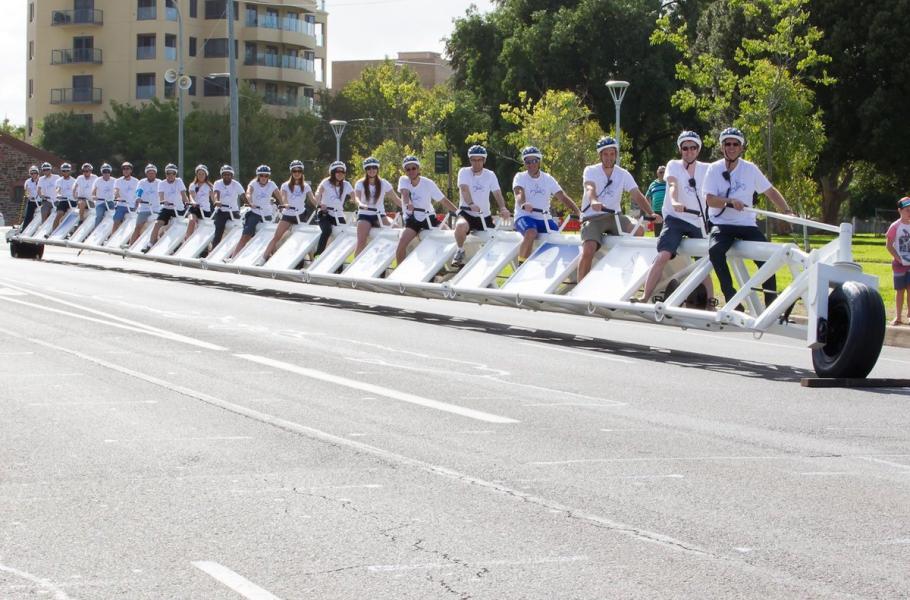 V současnosti nejdelší bicykl světa vznikl coby ročníkový projekt studentů oboru strojírenství na University of South Australia. Měří 41,42 m, což přibližně odpovídá dvěma bowlingovým dráhám, a přestože má rozšířené pneumatiky, žádné další stabilizační prvky do vínku nedostal: Přední jezdec zatáčí, zadní uvádí šlapáním kolo do pohybu. Aby byl studentský rekord platný, museli tvůrci před komisaři ujet alespoň 100 m – a když se o to v roce 2015 poprvé pokusili, selhali. Ke druhé jízdě se odhodlali v menším počtu (předtím na kolo usedlo 20 lidí) a stabilitu nakonec udrželi, čímž si vysloužili zápis do Guinnessovy knihy rekordů. (foto: Profimedia)