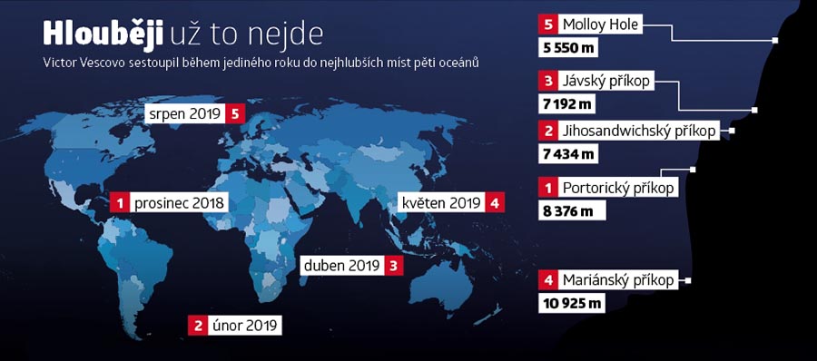 Dokončit ambiciózní oceánskou výzvu trvalo deset měsíců. V prosinci 2018 se tehdy 52letý Victor Vescovo dostal na nejhlubší místo Atlantiku, o dva měsíce později následoval Jižní oceán, v dubnu 2019 ten Indický a o pár týdnů později i Mariánský příkop v Pacifiku coby nejhlubší místo planety. Na jeho dno se před bývalým americkým námořním důstojníkem podívali pouze tři muži: roku 1960 dvoučlenná posádka batyskafu Trieste Don Walsh s Jacquesem Piccardem a před deseti lety režisér James Cameron, kterého tam přivedl záměr natočit unikátní 3D záběry pro své filmy.