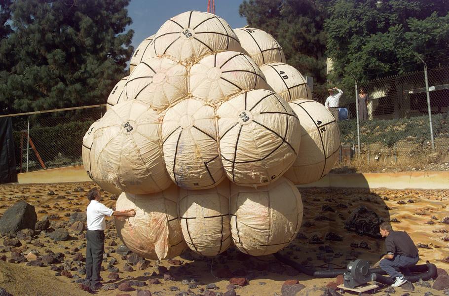 U misí Pathfinder a následně u roverů Spirit a Opportunity se dostal ke slovu prakticky totožný systém: osm sekund před kontaktem s povrchem rudé planety se začalo nafukovat 24 airbagů, každý zhruba o průměru 1 m. Sondy se v té chvíli ještě snášely na padáku a následně se zažehly brzdicí motory na tuhé pohonné látky. Po dvou sekundách snižování rychlosti se průzkumník v kokonu airbagů uvolnil, konkrétně ve výšce 20 m při nulové rychlosti. Povrchu pak dosáhl volným pádem rychlostí 18 m/s a v důsledku balonovitého tvaru několikrát poskočil, než se zastavil. Poté bylo nutné vaky vyfouknout a zajistit, aby nezkomplikovaly rozkládání sondy.