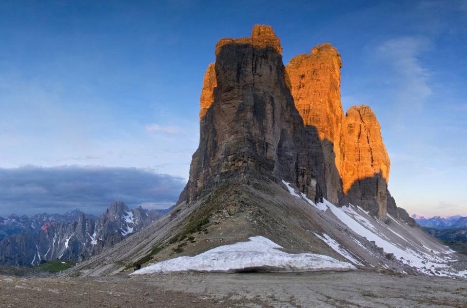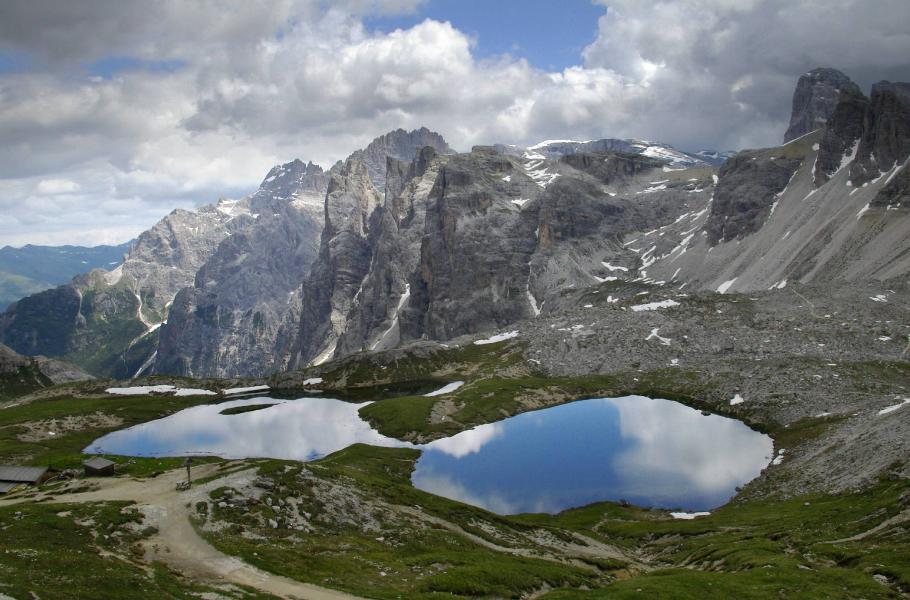 Kousek za sedlem (2 454 m n. m.) se konečně otvírá typický pohled na Tre Cime. Skalní zuby, které do první světové války tvořily hranici mezi Rakouskem a Itálií, měří 2 999 (Cime Grande), 2 973 (Cime Ovest) a 2 857 (Cime Piccola) metrů. Poválečné uspořádání přiřklo celé území Itálii, avšak zůstaly zde početné německé menšiny i jména (po německy tedy Drei Zinnen). Slavné via ferraty, zajištěné cesty, umožňující i nehorolezcům vystoupat na některé z vrcholků, mají (jako ostatně spousta jiných věcí) svůj původ ve válečném běsnění, které se nevyhnulo ani zdejším horám. Tunely a žebříky usnadňovaly vojákům pohyb v těžkém terénu, dnes slouží bohulibějším účelům.