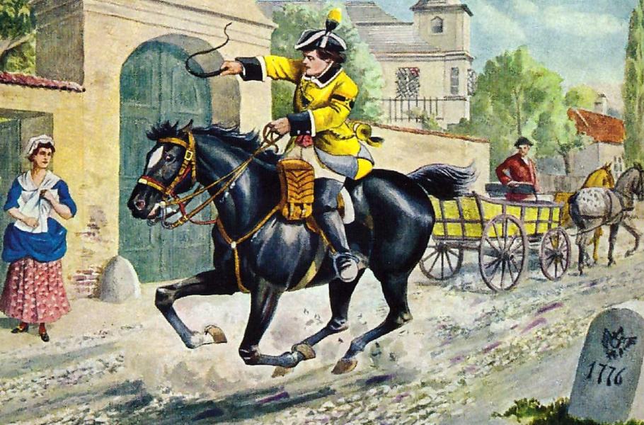 Spěšný poštovní kurýr s koženými dopisními brašnami na ilustraci z roku 1776. (ilustrace: Shutterstock)