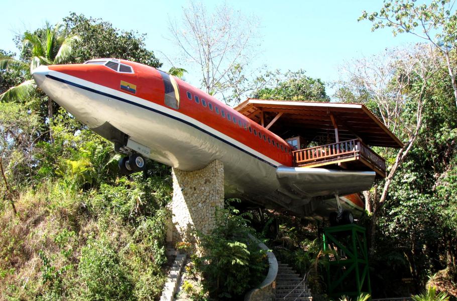 Jeden z apartmánů kostarického hotelu Costa Verde vznikl z letounu Boeing 727. Stroj z roku 1965 přišel o část křídel a jeho trup vetknutý do přepychové chaty se změnil v dovolenkové útočiště se dvěma klimatizovanými ložnicemi. (foto: Profimedia/ČTK)