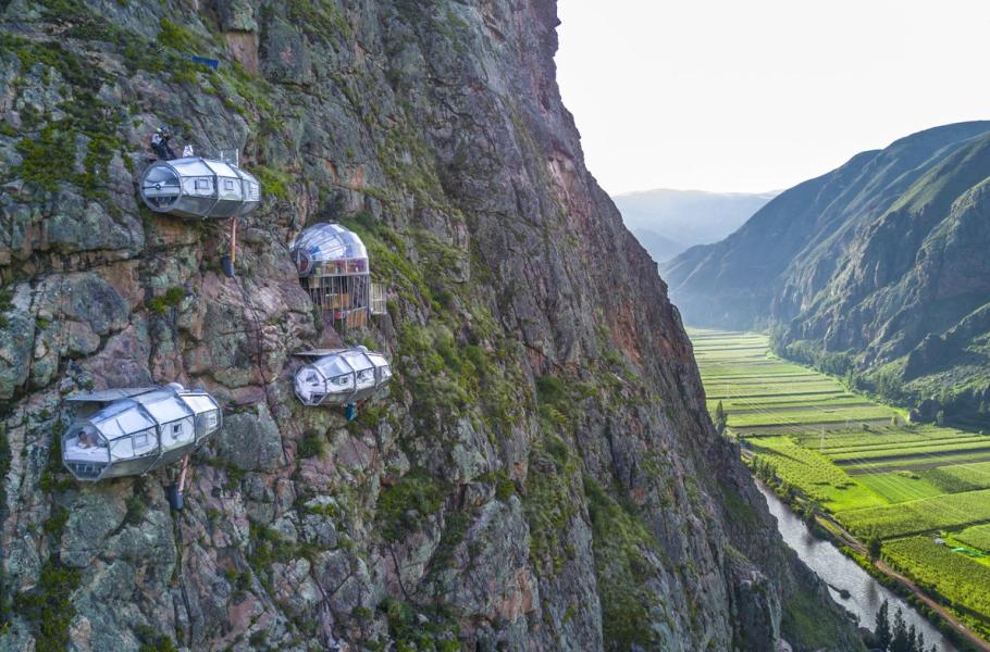 Prosklené kukaně Skylodge Adventure Suites zavěšené na skále ve výšce sto dvaceti metrů shlížejí na peruánské údolí Valle Sagrado de los Incas. V ceně ubytování je také doprava a služby horského vůdce, takže se nemusíte bát, že byste si s cestou nahoru museli poradit sami. (foto: Profimedia/ČTK)