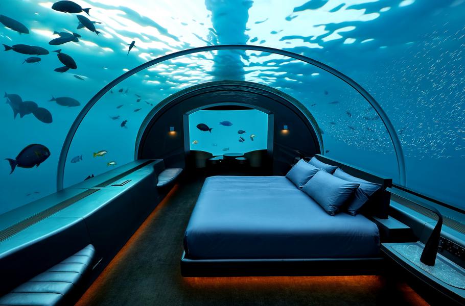 Luxusní vila The Muraka přivítala první návštěvníky v roce 2018, a odstartovala tak novou éru podvodního hoteliérství. Nachází se u břehů maledivského ostrova Rangali a nabízí možnost nocovat v proskleném dómu pod hladinou Indického oceánu. (foto: Profimedia/ČTK)