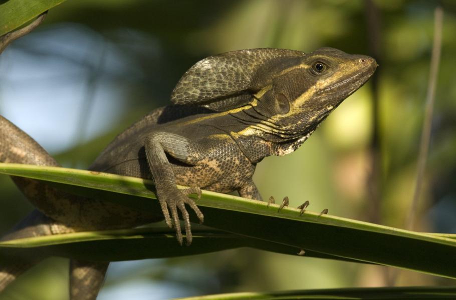 Ukryt u malé, vodní vegetací částečně zarostlé tůně, pozoruji v šeru panamského pralesa neobyčejné divadlo. Z křovin po obvodu tůně občas vyběhne malý ještěr, jako malý tyranosaurus se vztyčí na zadních nohách a velkou rychlostí přeběhne vodní hladinu. Je to další zástupce leguánů, bazilišek hřebenatý (Basiliscus basiliscus), který předvádí svou schopnost běhat po vodě. Dokáže vyvinout rychlost 10–12 km/hod a při běhu využívá pouze zadní nohy s dlouhými prsty. Opírá se při tom o dlouhý ocas, kterým manévruje. Nad hladinou ho drží povrchové napětí vody a to, že se občas opře o různé plovoucí předměty a vodní vegetaci.