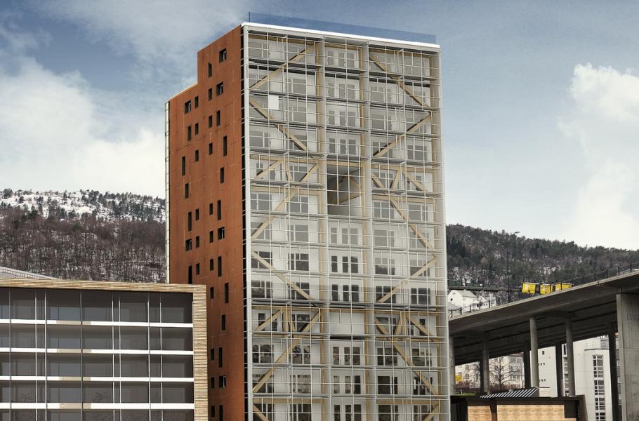 Aktuálně nejvyšší obytná dřevěná budova světa byla dokončena loni v únoru: Jejích čtrnáct pater se vyšplhalo do výšky 52,8 m. Stavba se nachází v norském Bergenu, a přestože je vnitřní konstrukce celá dřevěná, vnější povrch kryje kvůli drsnému počasí sklo a plech.