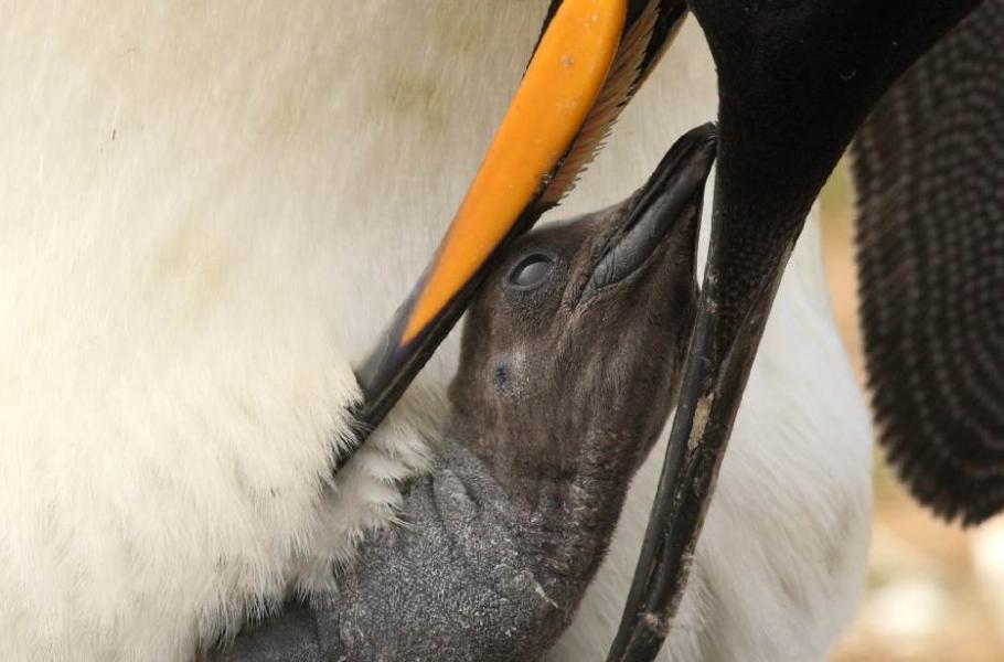 Když začne mládě rozbíjet skořápku vajíčka, trvá i několik hodin, než se ze svého dočasného domova zcela vymaní. Dospělý tučňák mu v tom nijak nepomáhá, spíš naopak. Když se první část skořápky odlepí, ihned ji zobákem vrací na původní místo a ve snaze chránit novorozence před chladem nijak nepolevuje. Poté, co se mládě dostane ze skořápky, zůstává další dlouhé dny v teple pod břichem rodičů. Jen když má hlad, vystrčí krk se zobákem nahoru a dožaduje se potravy. Nějakou chvíli škemrá a rodiče mu ze zobáku vyvrhnou natrávenou kašovitou hmotu.