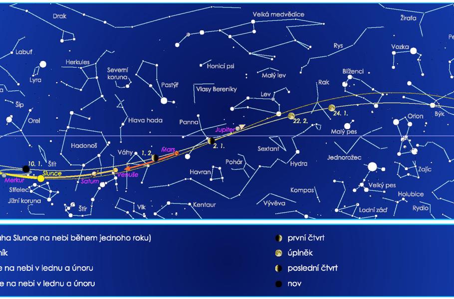 Během druhé poloviny ledna se na obloze naplno objeví výrazná souhvězdí zimního nebe. Jde zejména o tzv. zimní G, které je vytvořeno z několika jasných astronavigačních hvězd nacházejících se v různých souhvězdích.