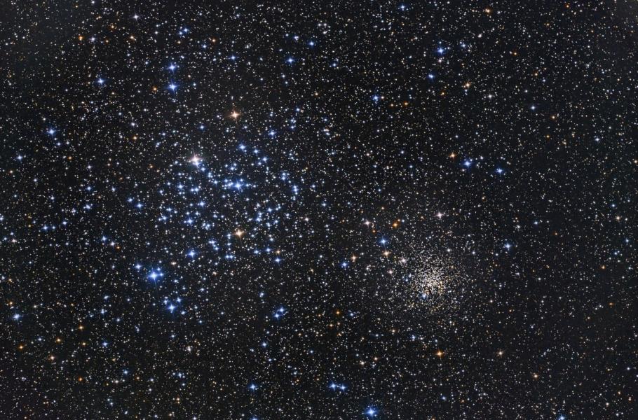 Nápadnější M35 se nachází téměř tři tisíce světelných let daleko a jde o mladou otevřenou hvězdokupu, jež vznikla asi před 150 miliony let. Drobná NGC 2158 je výrazně starší – astronomové se domnívají, že se mohla zformovat před dvěma miliardami let – a oproti M35 leží čtyřikrát dál.