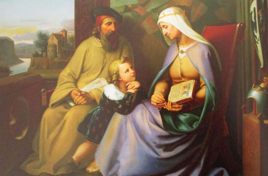 Sv. Ludmila na Tetíně vyučuje svého vnuka Václava. Malba Josefa Vojtěcha Hellicha ze druhé poloviny 19. století. (zdroj: Wikimedia Commons, CC0)