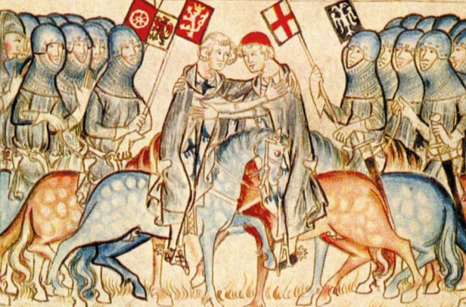 Jan Lucemburský se potkává se svým strýcem Balduinem, arcibiskupem trevírským, přičemž každý má za sebou svoji družinu. Dobová ilustrace z Kodexu Balduina Trevírského