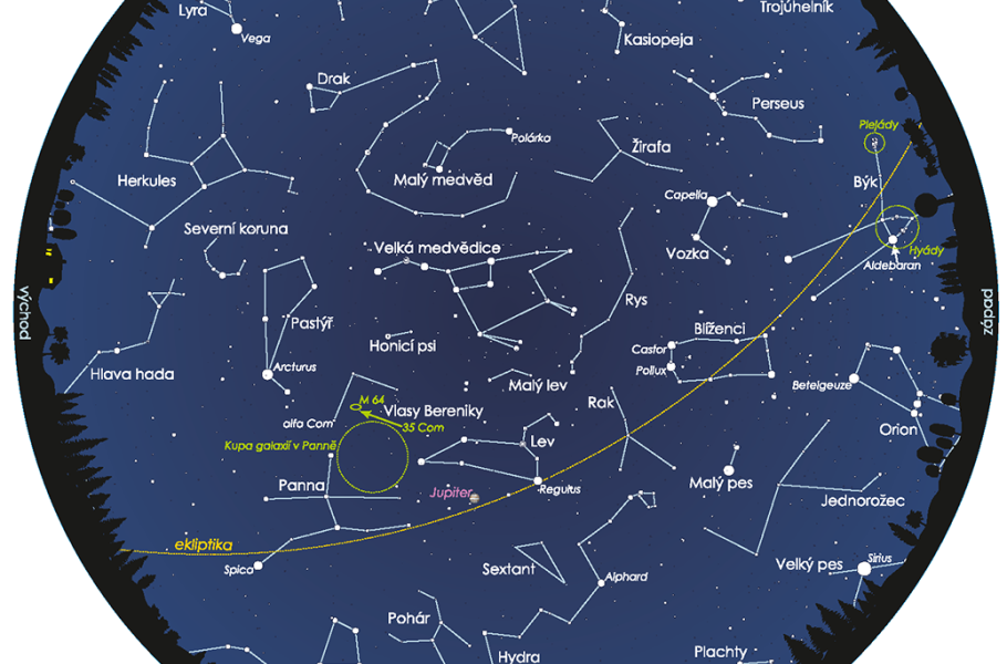 Pokud bychom měli vybrat charakteristické objekty jarní, respektive dubnové noční oblohy, pak by šlo zcela jistě o galaxie. Běžné galaxie jsou však bohužel až na pár výjimek natolik slabé a dosahují tak malých úhlových rozměrů, že je bez dalekohledu zkrátka nespatříme. Po galaxiích zkuste pátrat třeba na pomezí souhvězdí Panny a Vlasů Bereniky. Právě tam se totiž rozkládá tzv. kupa galaxií v Panně, jež zahrnuje desítky hvězdných ostrovů dostupných amatérským přístrojům.