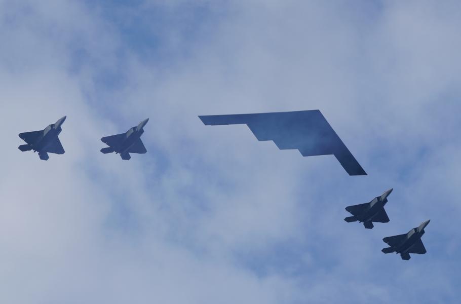Působivý snímek zachycuje bombardér B-2 v doprovodu dalších letadel USAF během oslav Dne nezávislosti, 2020. (foto: Shutterstock)