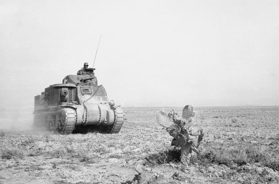 Americký tank M3 Lee postupuje tuniskou pouští, aby podpořil vlastní pěšáky. Spolupráce mezi infanterií a obrněnci ale poněkud vázla. (foto: Wikimedia Commons, U.S. Army, CC0)