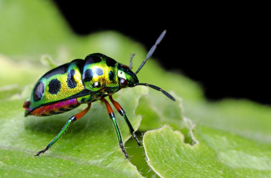 Takto v detailu se mohou měňavé metalické krovky zdát takřka nepřehlédnutelné. Ve skutečnosti ale zřejmě mají velmi dobré kamuflážní vlastnosti. Na snímku je druh Chrysocoris stollii z čeledi štítovkovitých (Scutelleridae), který je běžný v jihovýchodní Asii.