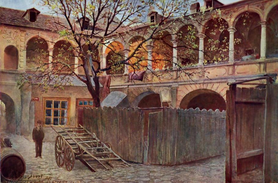 Tak se na jeho plátno dostal také dům U zlatého stromu (nebo taky u U zeleného stromu) stojí na Dlouhé třídě a představuje vzácnou architektonickou památku. Kdysi to byl jeden z mnoha pražských várečných domů, které měly povolení k výrobě piva. Původně se jednalo o dva gotické měšťanské domy, jež prošly rozsáhlou renesanční úpravou. Na severní a východní straně dvora vznikly renesanční arkády s rostlinným ornamentem, později doplněné na západní straně raně barokními arkádami. Současnou podobu domu poznamenala přestavba z dvacátých let 20. století. Celá budova byla zvýšena o druhé patro a podkroví, bylo odstraněno staré schodiště a zmodernizováno průčelí. Převážně renesanční podoba objektu tím byla značně porušena, takže nádvoří domu U zlatého stromu dnes působí poněkud odlišně než na Jansově akvarelu.