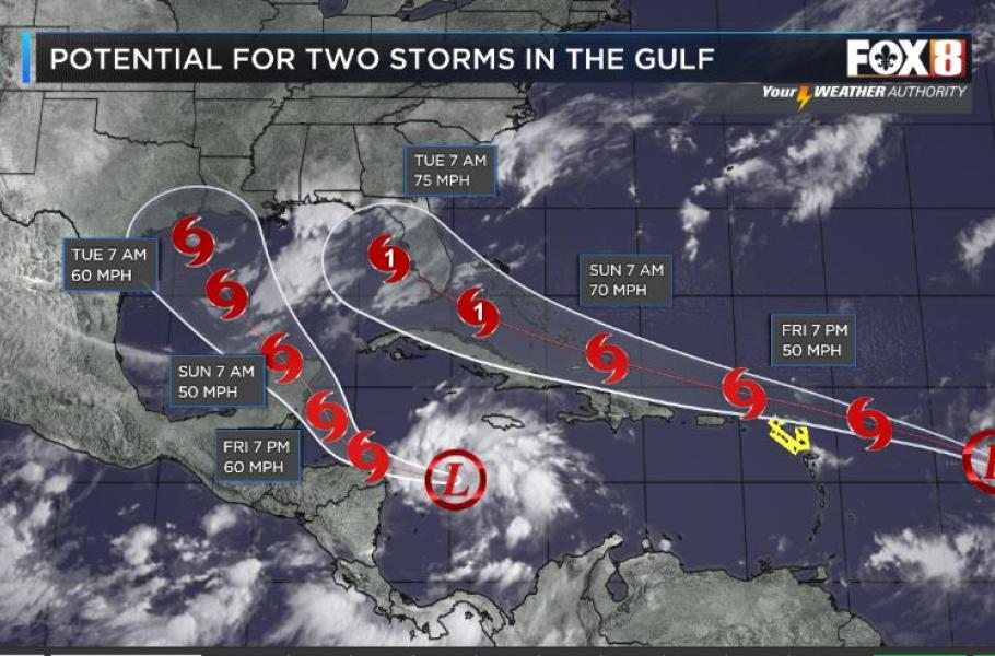 Předzvěstí těchto dramatických bouří by mohl být už příští týden. V úterý by se v oblasti amerického pobřeží Mexického zálivu mohly vyskytovat hned dva hurikány najednou. V současné chvíli jsou v podobě sílících tropických depresí, označených TD 13 a TD 14. Pokud se vyvinou do podoby tropických bouří až hurikánů, tak dostanou jména Laura a Marco.