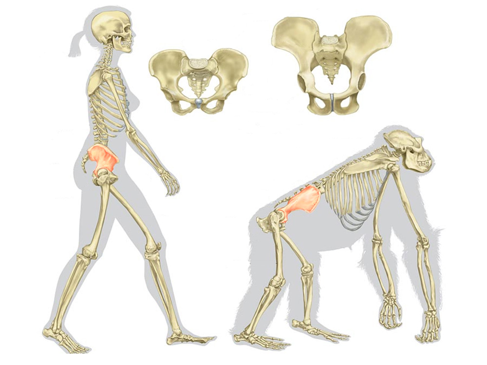 Ukázalo se, že klíčové změny se týkají kosti zvané ilium (kyčelní kost), která je důležitá pro stabilitu při chůzi, protože ukotvuje hýžďové svaly a chrání vnitřní orgány. Tou první je rotace chrupavky o 90 stupňů v 7. týdnu těhotenství. Zatímco u ostatních primátů zůstává ilium vertikální, u lidí dochází k její rotaci. Díky tomu je naše pánev dostatečně široká a zároveň nízká, což je zásadní pro stabilní vzpřímenou chůzi.