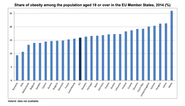 Česko patří v rámci Evropské unie k zemím s větším počtem obézních lidí. Podle nové statistiky úřadu Eurostat bylo v roce 2014 v ČR obézních 19,3 procenta dospělých, přičemž unijní průměr byl 15,9 procenta. Hůře než Češi na tom byli podle poslední statistiky Eurostatu v rámci osmadvacítky jen Britové, Estonci, Maďaři, Litevci a Malťané.