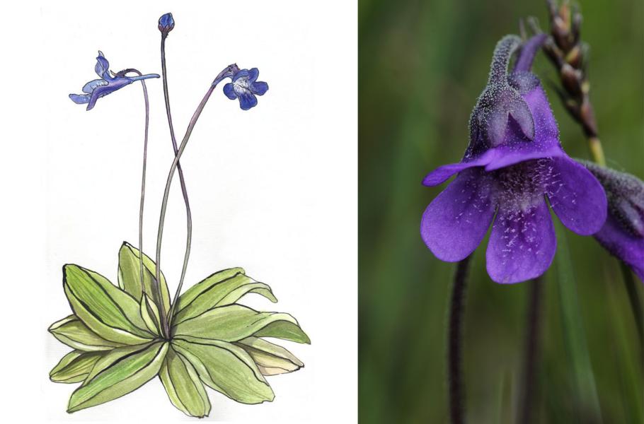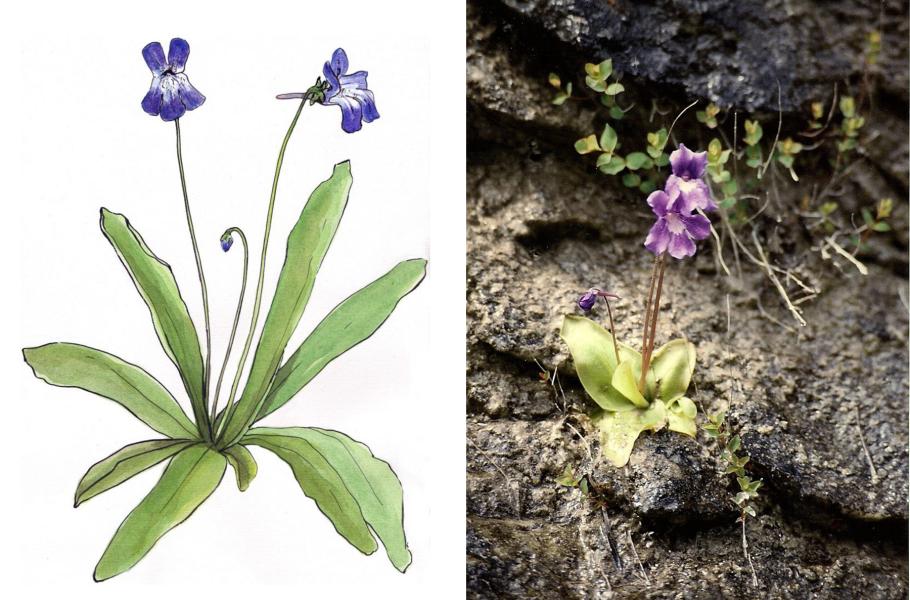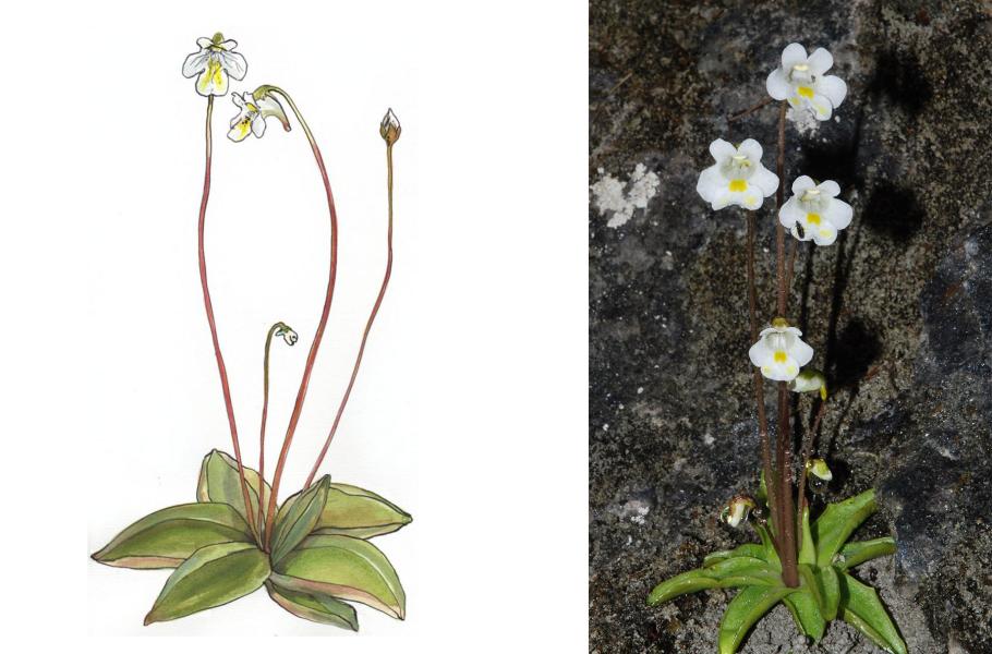 Tučnice s poměrně velkými, až 3,5 cm dlouhými květy. Stopkaté žlázky má i na spodní straně listů. Zajímavé je, že vytváří dva druhy listů – na jaře listy kratší, v létě dlouhé, jazykovité. Přezimuje pomocí zimních pupenů. Roste pouze na svislých mokvavých skalních stěnách, na rozdíl od jiných evropských druhů se nevyskytuje na slatiništích a prameništích. (foto: Flickr, José María Escolano, CC BY-NC-SA 2.0 + Tereza Samková (ilustrace)