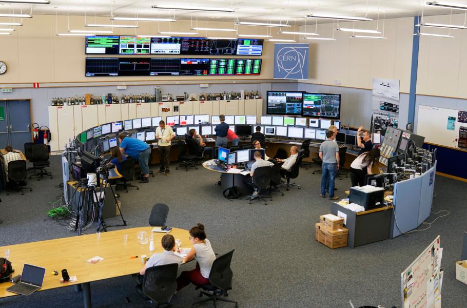 Hlavní řídicí velín CERNu tvoří rozlehlá hala se čtyřmi samostatnými „ostrůvky“, kde se každý stará o svůj zadaný úkol, od produkce částic přes jejich urychlení až po finální dodání do experimentálních laboratoří. Kromě řady obrazovek a počítačů zahrnuje místnost i speciální povrch jako obklad, který brání odrazům zvuku. Na pracovišti tudíž nepanuje velký hluk, ani když je plné lidí. Vybavení místnosti navíc podléhá přísným ergonomickým normám, a to nejen kvůli pohodlí zaměstnanců, nýbrž i s ohledem na bezpečnost. Pracovník provozu totiž musí z pochopitelných důvodů nepřetržitě a bez problémů vidět na všechny důležité obrazovky.