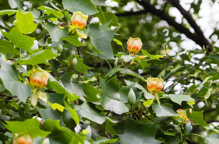 Exotický liliovník tulipánokvětý: Strom s tulipány ve větvích