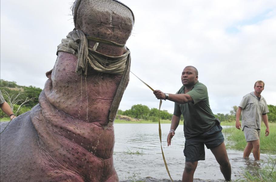 Za zdánlivě mírumilovným zevnějškem hrocha se skrývá agresivní stvoření, které může vážit až 2,7 tuny. Tlamu umí rozevřít v úhlu 180 stupňů a jeho čelisti vytvářejí tlak 140 kilogramů na centimetr čtvereční, což z něj činí rekordmana říše býložravců. Není tedy divu, že hroši každý rok zabijí na pět set lidí a veterinární péče o zmíněné obry patří mezi nejvíc nebezpečné profese. (foto: Profimedia)