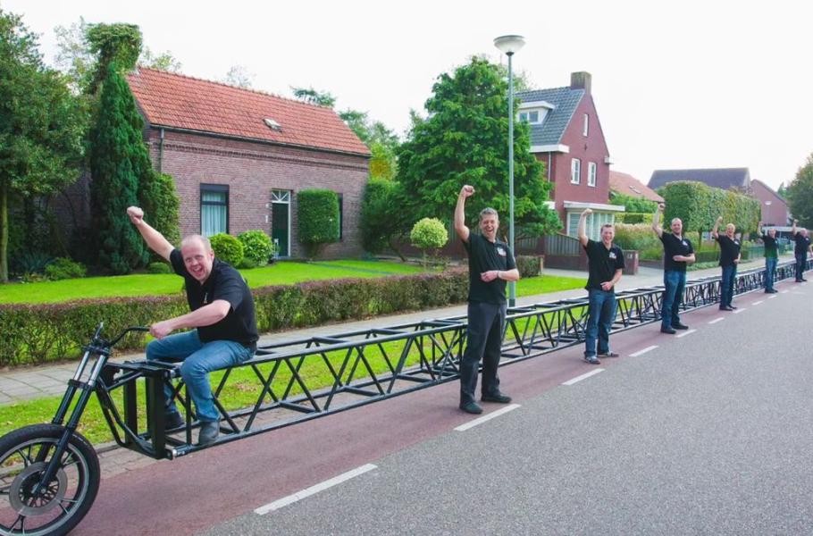 Svého času nejdelší bicykl na světě, jenž si v roce 2016 vysloužil i zápis do Guinnessovy knihy rekordů, vznikl nepříliš překvapivě v Nizozemí. Tamní společnost Mijl Van Mares Werkploeg postavila stroj s úctyhodnou délkou 35,79 m, který má přesto pouze dvě kola. Jeho řízení vyžaduje dva lidi: Jeden drží řídítka, druhý šlape na samém konci dopravního prostředku. Holandskou raritu však již v době zápisu překonal australský konkurent, měřící přes 41 m.