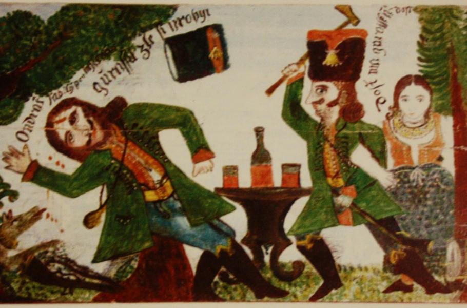 Zabití Ondráše Jurášem, olej na dřevě, konec 18. století (muzeum Ślązska Ćieszyńskiego).